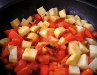 呆胡萝卜炒至金黄时,放入西红柿同炒。因为西红柿的量比较大防止太酸可以酌情放一些糖