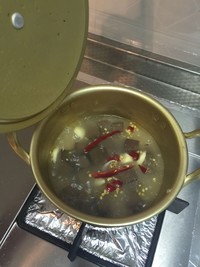 往空的小铜锅子里加入高汤料,猪油,蒜瓣一切二加入,干辣椒我也是对半剪开的 再放入沥干后的鸭血