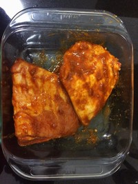 在肋排两面均匀的刷上调好的酱料,多刷几遍哦。我用的排骨是那种肋排,原本想分开2次做的,后来索性切开了一次性做完吧