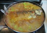 Tip:1. 煎鱼时要想鱼皮不粘锅, 一是尽量不让鱼身上有水; 二是用姜搽试锅; 三是热锅凉油; 四是鱼未煎好时不要急于翻动鱼; 2. 鱼煎好后再加入适量的水, 莴苣等一起煮, 水以没过原料为主; 3. 火锅底料就是外面买的成品, 这样可以减少很多辅料, 但味道一样好; 4. 加入调料后收汁时要用铲将汤汁不停地浇淋在鱼的表面, 这样鱼更入味; 5. 配料莴苣也可以换作其他菜, 但莴苣是绝配, 不信你试试。