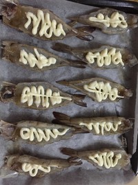 Tip:1.盐和黑胡椒粉可根据自己口味放; 2.我一般会涂抹完盐和黑胡椒粉以后放置一小会儿,让虾入入味儿,大概5-10分钟后再挤上沙拉酱; 3.虾用的是冰鲜的大青虾,或者其他冰鲜的海虾也可以。