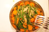 用炒锅烩蔬菜。油热加蒜调味,加入豆角,胡萝卜和金针菇,用料酒和生抽调味。细节就补赘述了。