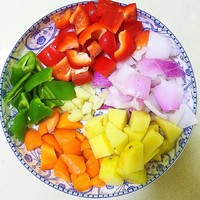 土豆切丁放水里泡着备用,胡萝卜洋葱青红椒也同样切丁。