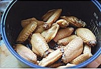然后再把抓捏好的鸡翅和调料倒入电饭煲中,盖上盖子,按一下煮饭键开关