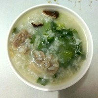 将腌好的鸡肉、香菇、姜粒下粥,煲15分钟,下芥菜,煲10分钟,收工。因为腌的鸡肉已经够咸味,不用再下其他调味。好吃