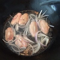 锅内放入油,加入翅中,翻炒一会加入洋葱。再翻炒一会,加入水。