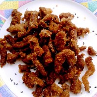 里脊肉切成条~放入所有调料腌二十分钟~油烧七成热~腌好的肉条裹面包糠炸成金黄色捞出既可~有炒熟的芝麻放点更香哦~
