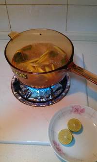 加入除小青柠之外的其他香料(香茅、柠檬叶和南姜),煮一小会儿;