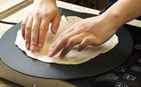 预热煎饼锅到很烫。这样面饼上去会很快鼓起来。刷少许油,把面饼铺到锅上,拉扯摊平