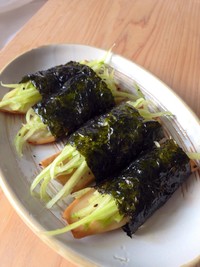 取出杏鮑菇片,晾涼後,上面放上黃瓜絲,接著取出韓國海苔片,卷上! 開動囉!