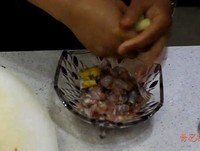 腌制牛蛙,碗内加入葱节、姜片,用手挤压葱节让汁水充分渗透到肉中,祛除腥味,5分钟之后,用蛋清上浆。