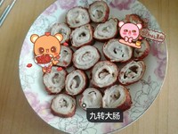 起锅放油,用温油下入大肠炸至定型后捞出,等油温升到8成热时,下锅复炸一下捞出。