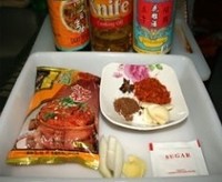 在蒸笼里铺上一层粽叶,然后将拌好的肥肠平铺在粽叶上