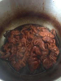 大肠买回后,翻过来,撕掉部分里面的油,注意不能全部撕光,要保留一部分,不然做出来的大肠会太干。 备注:翻大肠可以一头放水龙头上往里面灌水,一边把大肠往里面塞,很容易的。