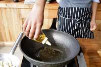 锅内热油,如果想做出冬笋的肥美感,可直接用牛肝菌油来炒,如果心疼牛肝菌油太贵,可以在最后起锅时淋油用牛肝菌油。