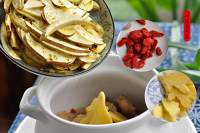 先准备好食材:将美味牛肝菌及姜切片,小嫩鸡切块,蒜切丁,准备些料酒和枸杞,还有盐。