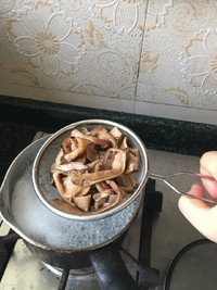 提前15分钟用水冲洗并泡发牛肝菌,切了片的牛肝菌很容易泡发的,不用担心泡不开,泡发的水留着!呵呵,你懂的