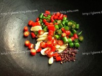 鸡胗买回来后反复仔细清洗用刀刮去内层残留的黄色杂质,之后切成薄片,加上一少盐、适量淀粉码味;青红椒切成约一个指关节长短的段、大蒜切片备用