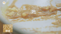 放入蒜煸香,放入200g牛肉末炒至变色出油。
