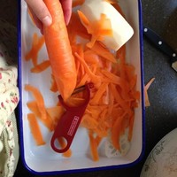 2 重复上述步骤,加入水时加入10克生姜片,去腥味。 在第二次煮制时,将红萝卜和莲藕用削皮器削成长薄片,这时刚好到时间。(因为红萝卜和莲藕不易入味,所以用削皮器刨,既快又好,不挑战刀功)o(^_^)o