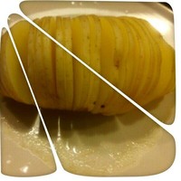 6.土豆烤/蒸好后把腌好的五花肉剪成合适大小夹在每片土豆里。刷一层橄榄油淋上腌肉的汁液,再撒上一层黑椒粉(不要太多) 7.重新放回微波炉/电饭煲烤/蒸20分钟。(微波炉需要在土豆旁加放小杯水,电饭煲需要加盖一层保鲜膜)