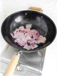 锅内倒少许的油,放入肉片,小火慢煎,煎至肉片微卷。这样能把肉片中的油脂煎出,这样五花肉吃起来口感就不肥腻了