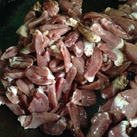 加盐,翻炒至鸡心变色缩水。加糖和白胡椒。