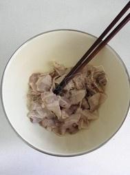拣去姜片和花椒粒,肉片捞出控净水