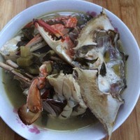 锅里倒少许油加热,放入葱头姜丝爆出香味,放入切好的螃蟹翻动不要粘锅,放点白糖,料酒,盐,继续翻炒让其入味,然后加入酸菜翻炒一下加点清水盖上锅盖烧开放点鸡精,葱就可以出锅了