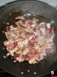 放入鸡胗鸡心大火爆炒,表面变色后,将渗出的水和油倒掉