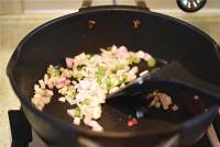 锅里余油越来越多,因为羊肉脂肪出来,倒去一些,剩下的炒芹菜碎和洋葱碎到断生。喜欢辣味的可以放点干辣椒一起炒。