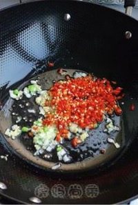 然后放入打碎的羊肉末,快速的翻炒至羊肉变色,也让膻味大量的释放出