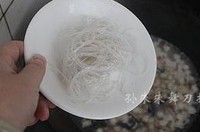 放入粉丝和切成片的熟羊肉(逆着肉丝切,如果牙口不好就切成和馍丁一样大小的小丁),用盐、胡椒粉调好味