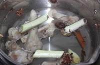 将焯过水的羊骨放入汤锅中,再放入满锅的清水,煮开锅后撇去浮沫,然后放入葱段、拍破的生姜、花椒、八角、草果、白芷、砂仁、良姜、桂皮、小茴香、橘皮