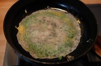 待特大与蕃薯糊七八熟后加入青菜段略煎几十秒