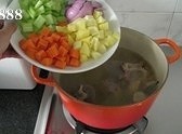 倒入洋葱、胡萝卜、土豆和西红柿继续炖半小时