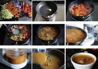 在炖汤的后半小时,把所有蔬菜配料用黄油炒软,先西红柿煸炒,然后加入土豆\洋葱等所有配料炒香后,加入些牛尾汤(只是汤部分),蔬菜(尤其是土豆块)炖酥软(二十多分钟),然后放入料理机打成蔬菜泥
