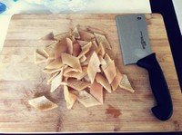 将猪皮洗净,焯水。切成菱形状。(可以切成任何自己喜欢的形状)。