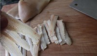 把猪皮洗了把毛清理干净,用清水泡个一两小时。然后入冷水锅+姜葱+一个八角,烧开后转小火煮20分钟。