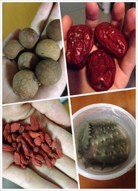 把红枣去核、桂圆去皮、枸杞洗干净。我的枸杞是之前洗好的、已经干了。如果是超市买的枸杞、用前一定记得洗洗干净哦