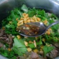 将切好肉片加入香菜和嫩芹菜段。 撒上香酥花生碎。 浇上麻辣汁搅拌均匀即可
