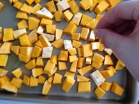 用手抓均匀,尽量让调味料均匀包裹每个南瓜丁,然后仍旧平铺开。