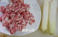 见锅中汤汁粘稠,立即倒入肉片;大葱