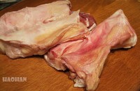 将牛蹄筋和牛肉解冻后飞水:飞水要掌握火候 烧的太久 不但牛蹄筋会缩的太硬 而且 胶质容易流失 水开几分钟后便可以捞出 用冷水冲洗干净