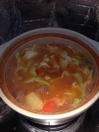 大约1.5~2小时后,将洗净撕成块的卷心菜最后加入汤锅中,并加入盐调味。