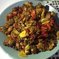 炖至少量汤汁后,加入干辣皮、葱、蒜,调大火翻炒收汁