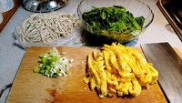 手擀面或买的成品面都可以。菠菜摘洗干净,焯开水,过凉水,沥干,切段。鸭蛋加入1/3茶勺盐和1小茶勺冷水打散,热锅倒入橄榄油,摊成鸭蛋皮,盛出切丝。切好香葱碎。