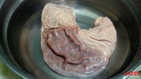 把鸡塞进猪肚,先进鸡屁股,用竹签封口。过沸水1分钟,在猪肚上扎几个小孔,防止猪肚爆开。