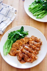 再烫一盘菜苔,把鸡腿排切成宽条,摆入盘中,配上白米饭,享用吧——
