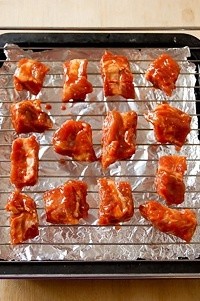 烤箱提前预热到200度。烤盘内铺上一层锡纸,放在烤箱的最下层。然后将排骨放在烤架上,放于烤箱的中层,以200度的温度,烤约40-50分钟左右,中途可用刷子把腌肉的蜜汁酱料再次涂在排骨上,这样烤出的排骨更入味、色泽更漂亮。